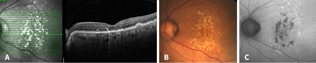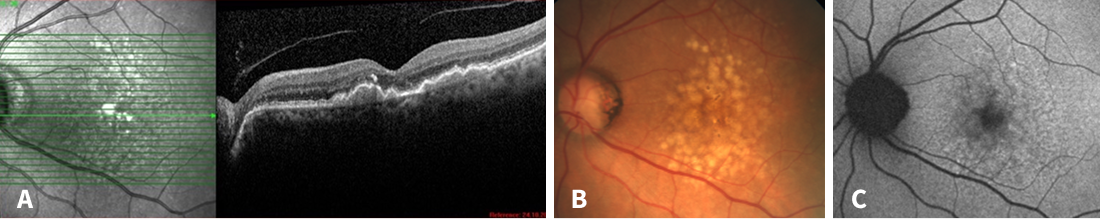 Figure 1. Multimodal imaging at the first visit. A: Intermediate AMD with drusenoid pigment epithelial detachments and hyperreflective foci. B: Fundus photography with yellow-white soft drusen, partially confluent. C: Patchy autofluorescence pattern with no signs of atrophy.