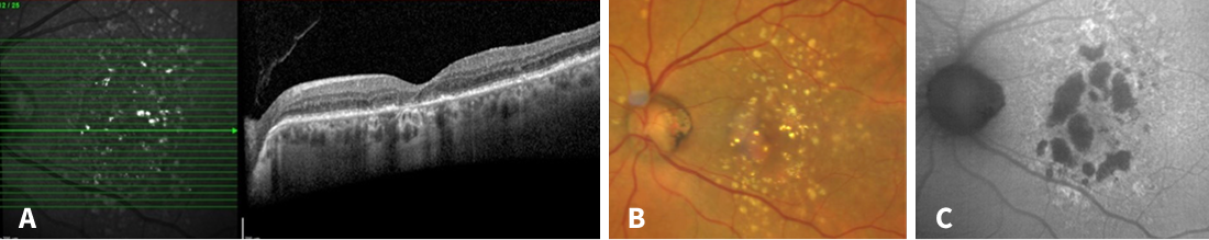 Figure 3. Multimodal imaging 6 years after the first visit. A: Geographic atrophy had developed with hypertransmission and complete retinal pigment epithelial and outer retinal atrophy (cRORA). B: Atrophic areas now can be seen fundoscopically. C: Hypoautofluorescent spots enlarged indicating an increasing geographic atrophy.