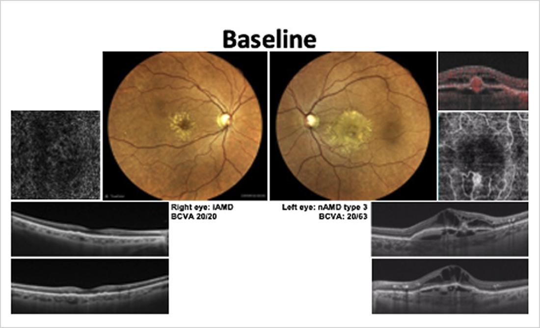 A 74-year-old White female was referred to our clinic for evaluation and management of newly diagnosed neovascular AMD (nAMD) in the left eye (OS), characterized by a retinal angiomatous proliferation (type 3 macular neovascularization [MNV]). At presentation, the patient reported the recent onset of metamorphopsia and blurred vision OS. The right eye (OD) had no symptoms but was monitored, given known bilateral drusen.