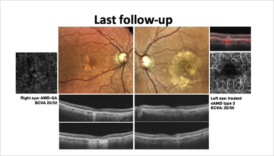 The patient began intravitreal anti-VEGF treatment in the left eye. For the right eye, AREDS2 supplementation was recommended, along with lifestyle counseling (smoking abstinence, UV protection). The visual prognosis was discussed. She was informed about the risk of progression to GA and the need for ongoing surveillance.