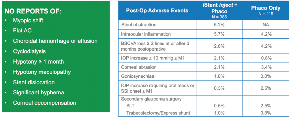 The iStent inject has an excellent and predictable overall safety profile similar to cataract surgery alone (Figure 2). Often, if an optometrist is comfortable comanaging patients who’ve had cataract surgery they are also comfortable comanaging patients who’ve had an iStent inject procedure.