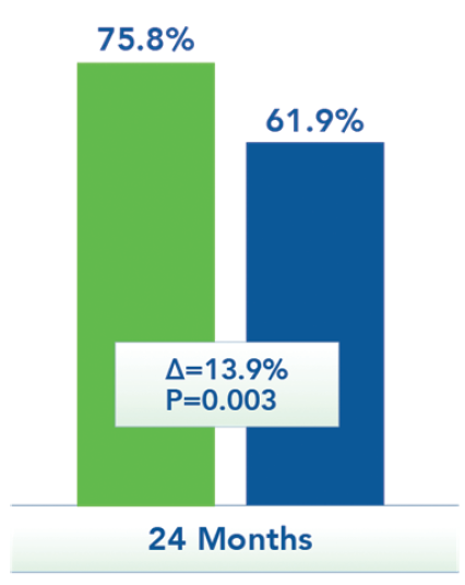 At 24 months, investigators found the iStent inject outperformed cataract surgery alone, with 75.8% of eyes achieving a 20% or more reduction in unmedicated diurnal IOP (DIOP) (Figure 3). At 23 months, 84% of iStent inject subjects that were responders were medication-free. This demonstrates that the iStent inject has the ability to not only lower IOP but also can reduce patients’ reliance on IOP-lowering medications at the discretion of the physician.
