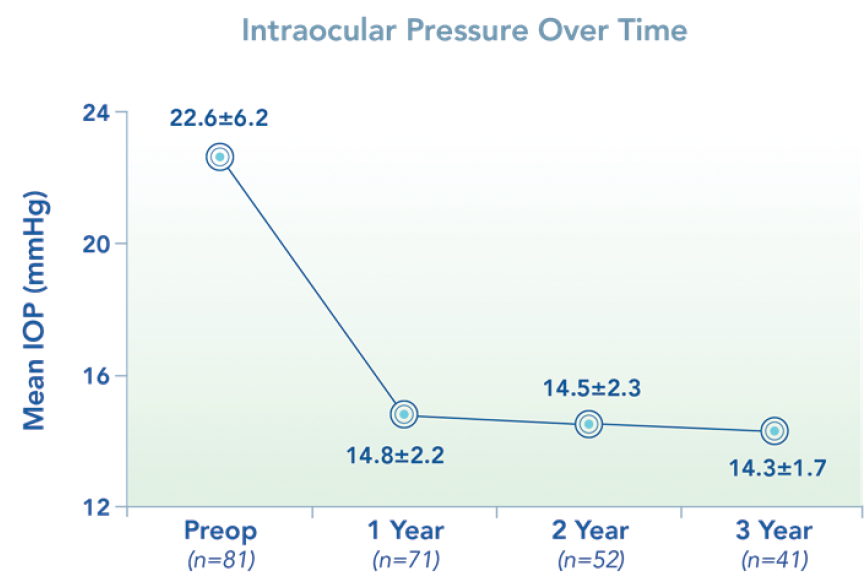 Figure 4 shows data from a consecutive case series of iStent inject patients collected by an individual surgeon in an independent study demonstrating durability over 3 years. Preoperative IOP was 22.6 ± 6.2 mm Hg and at 3 years was 14.3 ± 1.7 mm Hg, representing a 37% reduction of IOP.8 In separate studies involving iStent inject in Canada and Australia, the mean number of medications was reduced by 42% (decreasing from 2.3 to 1.2 medications)9 and 65% (decreasing from 1.7 to 0.6 medications)10 at 1 year.