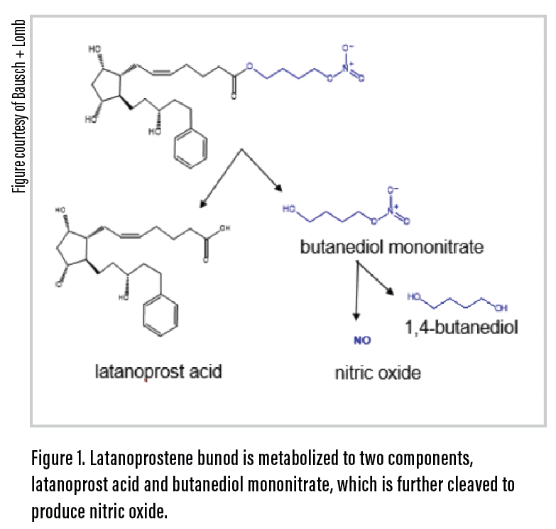 Latanoprostene bunod ophthalmic solution 0.024% (Vyzulta, Bausch + Lomb) is a single molecule that offers a dual mechanism of action, thus enhancing its overall efficacy compared with that of the other prostaglandin analogues (PGAs).1 The product contains latanoprost acid, which, like all PGAs, targets the uveoscleral pathway. In addition, latanoprostene bunod contains a novel subcomponent of nitric oxide, released from broken-down butanediol mononitrate,that directly targets the trabecular meshwork (TM) to relax the TM smooth muscle (Figure 1).