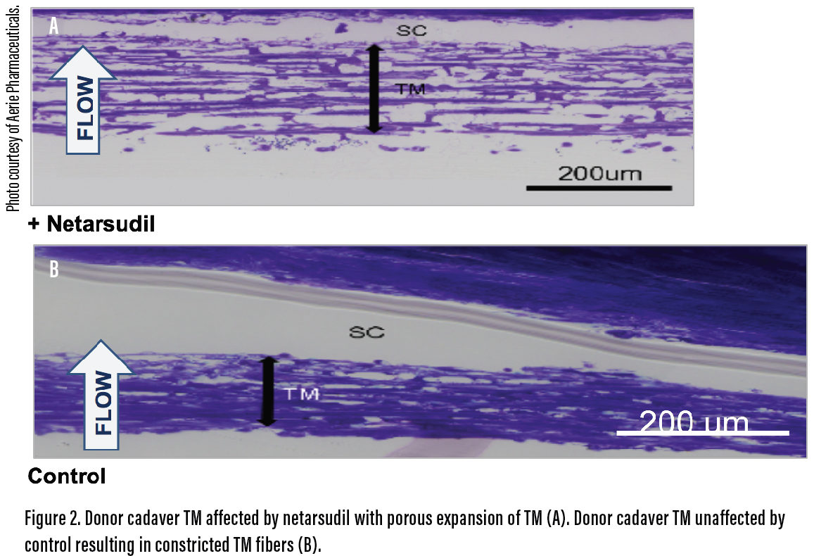 Netarsudil ophthalmic solution 0.02% (Rhopressa, Aerie Pharmaceuticals) is the first of a new class of glaucoma drugs—ROCK inhibitors—to enter the US market. Like latanoprostene bunod, netarsudil acts directly on the TM. It inhibits actin-myosin bonds to relax the TM and improve aqueous outflow (Figure 2). Netarsudil has additional mechanisms that decrease aqueous production and episcleral venous pressure. In the ROCKET studies, the drug decreased IOP by approximately 4 mm Hg to 5 mm Hg and showed efficacy in eyes with ocular hypertension and normal tension, potentially making the drug a first-line option for patients with low baseline IOPs.4
