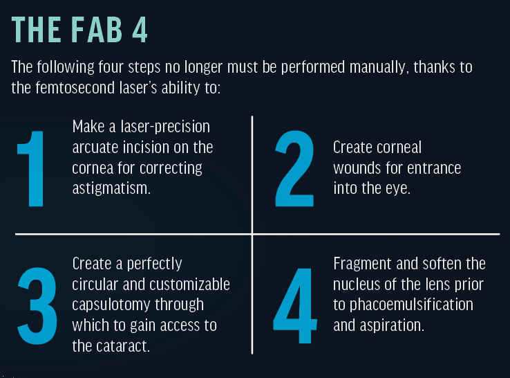 The femtosecond laser is able to perform four important steps of the cataract procedure that previously were done manually. Specifically, (from anterior to posterior), it can make a laser-precision arcuate incision on the cornea for correcting astigmatism, it can create corneal wounds to allow entrance into the eye, it creates a perfectly circular and customizable capsulotomy to gain access to the cataract, and it fragments and softens the nucleus of the lens prior to phacoemulsification and aspiration. Each one of these capabilities has had a major hand in automating the surgical procedure. These capabilities are discussed in more detail below.