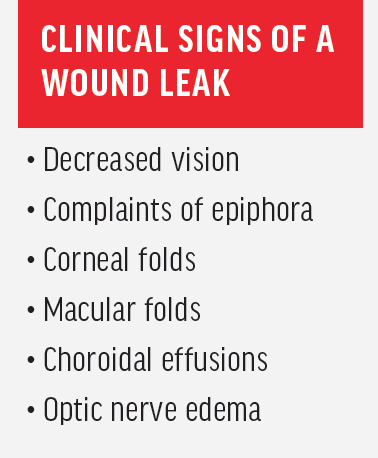 Patients should be seen every 1 to 2 days until the leak is resolved. Patients should be educated on continued use of a shield while sleeping and should be told to avoid rubbing their eyes and getting water directly into their eyes. Warning signs of infection should be reviewed as well. If the leak is not resolving, the IOP is consistently low, or the anterior chamber is shallow or flat, the patient should be referred back to the surgeon for consultation and possible surgical repair or revision.13,14