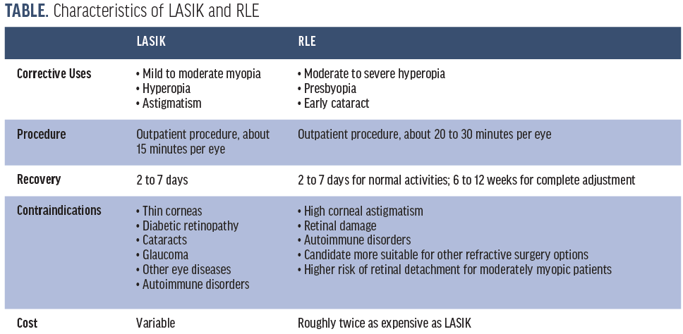 LASIK and RLE each have benefits and limitations. As with any procedure, the better option is the one that is best tailored to the individual patient’s needs. Obtaining a clear understanding of each patient’s wishes and then carefully explaining the options to him or her are crucial steps to achieving successful outcomes.