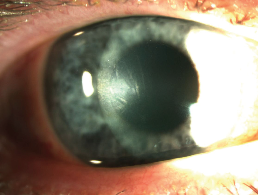 After 1 week, the patient’s distance UCVA was 20/80 OD, improving to 20/25 with pinhole testing. Slit-lamp exam showed improvement of the microcystic and stromal edema (Figure 2). The postoperative drop regimen was continued without change, although the patient was instructed to stop the moxifloxacin 2 weeks after surgery.