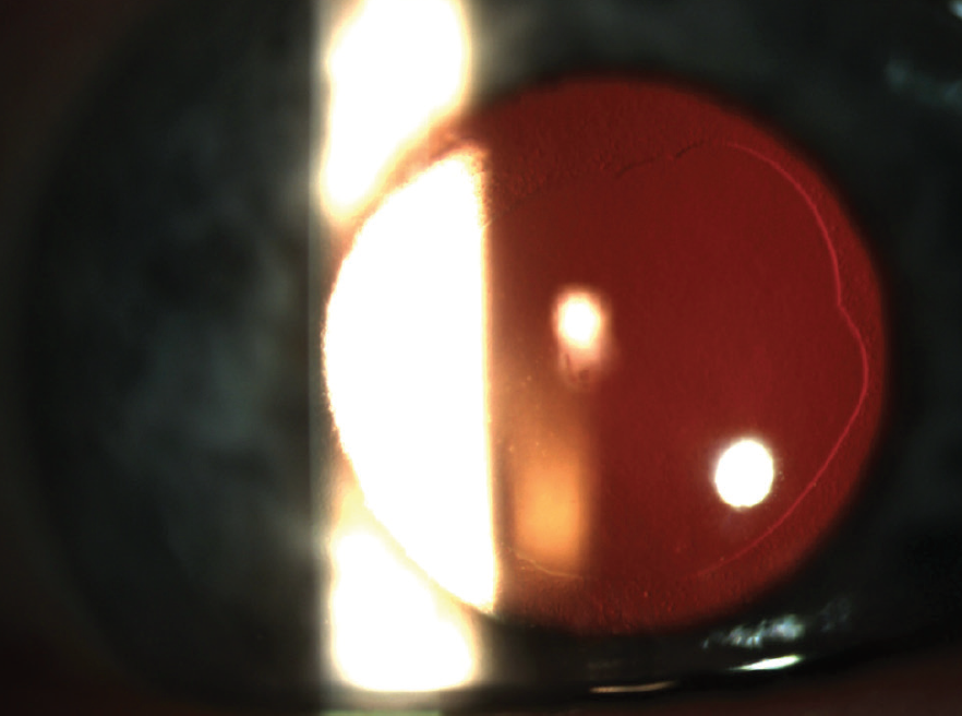 At the 3-month postoperative visit, UCVA had improved to 20/25 OD and BCVA was 20/20 (-0.50 +0.75 x 013°). Slit-lamp exam showed a central descemetorhexis with full resolution of corneal edema (Figure 3). At this time, the patient elected to proceed with the same surgical plan in the left eye.
