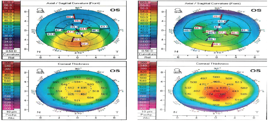 Again, the primary goal of CXL is to arrest the progression of corneal ectasia. The prospective multicenter clinical trial that supported FDA approval included more than 200 eyes with progressive keratoconus, half of which underwent CXL and half of which were monitored for some time prior to CXL (sham control). In the treatment arm, the maximum keratometry reading (Kmax) fluctuated during the first few months after CXL.4 A comparison of treated and untreated patients found a difference of 2.60 D in Kmax, with significant steepening in the sham control group and flattening in the CXL group. Often overlooked in discussions of this study is that slightly more than 50% of the patients who received CXL exhibited at least 1.00 D in Kmax flattening 12 months after treatment. A separate analysis found a similar result and reported that CXL successfully stopped corneal steepening.4