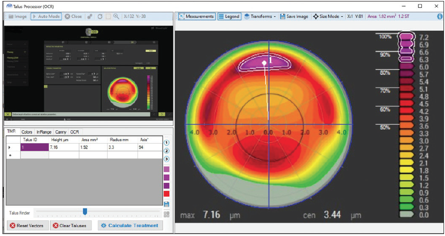 Phorcides uses geographic imaging software, or GIS, to analyze the topography of each cornea and identify visually significant areas of elevation. In geology, a small, elevated mound of material at the base of a larger hill or mountain is termed a talus, and this term has been adapted for describing small elevations seen on corneal topography as well (Figure 1). Each talus is analyzed by the GIS using optical physics to quantify the magnitude and direction of the induced astigmatism as a vector (Figure 2).