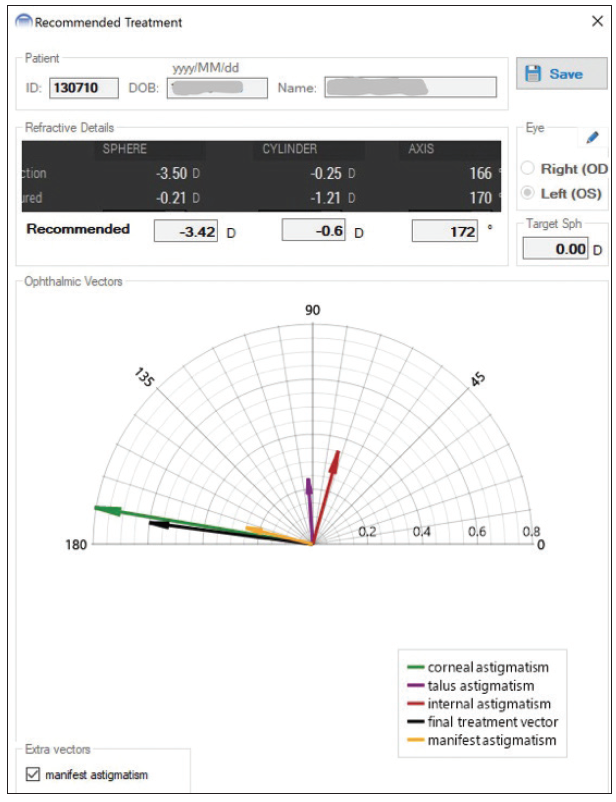 Each of these vectors is then entered into the algorithm, along with vectors for anterior corneal astigmatism, posterior corneal astigmatism, and internal lenticular astigmatism, and the program calculates a fully customized AI-recommended treatment in less than 10 seconds.