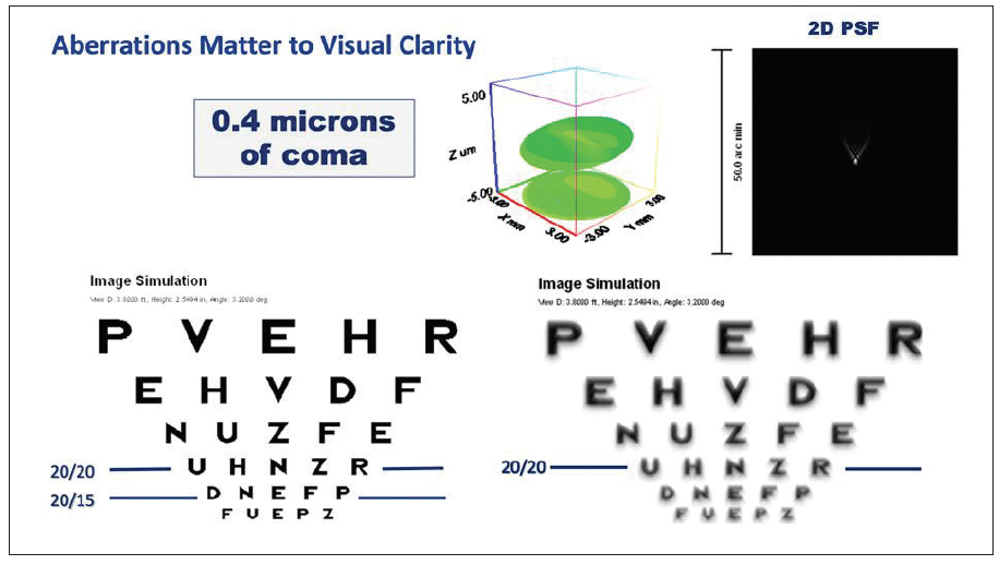 The ability to simultaneously neutralize all sources of astigmatism and corneal irregularities results not only in better visual acuity, but also in better visual quality. Normalizing the topography reduces higher-order aberrations such as coma (Figure 3) and trefoil, which in turn lessens blur and shadowing.