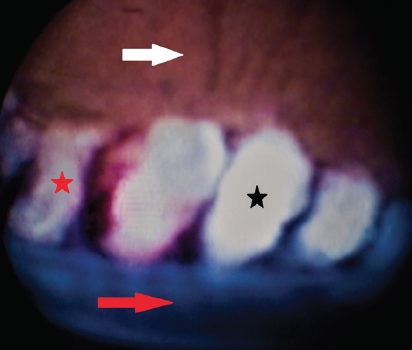 Figure 3. View of ciliary processes on the endoscopy unit monitor showing untreated ciliary process (red star), treated ciliary process with whitening (black star), posterior iris surface (white arrow), and anterior surface of lens capsule (red arrow).