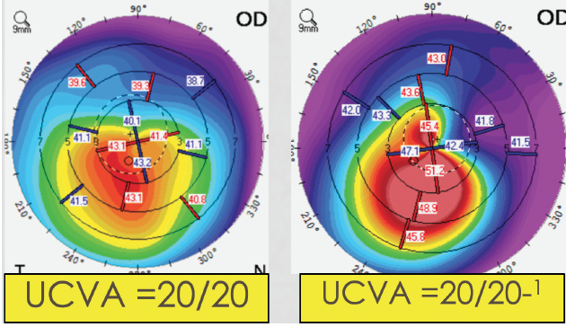 Figure 1. Clear signs of keratoconus on topography in two patients with 20/20 UCVA.