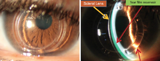 Figure 2. A scleral contact lens vaulted over the cornea of a 53-year-old patient with advanced keratoconus and a history of Intacs (Addition Technology) and CXL. BCVA is 20/40 with glasses and 20/25 with scleral lenses.