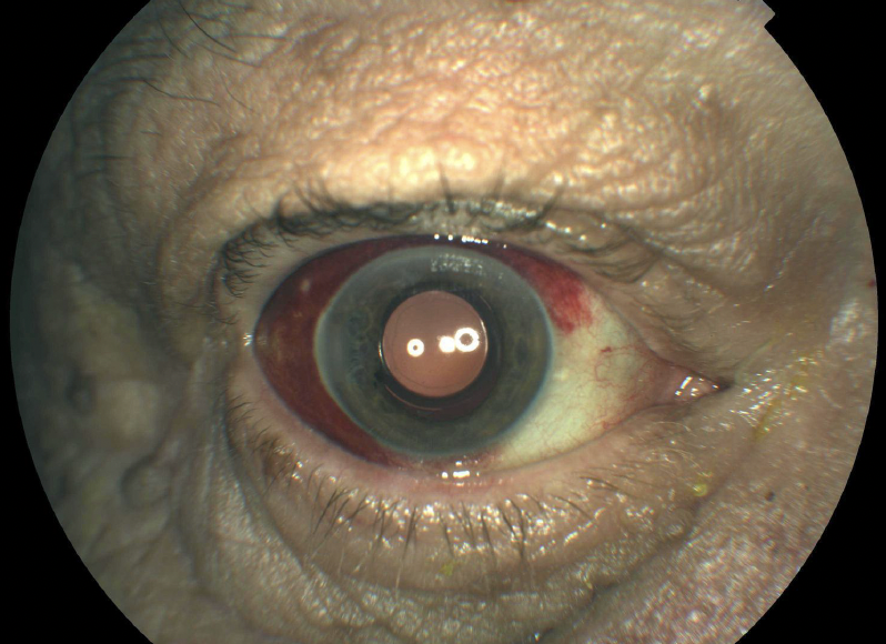 Figure 1. This image shows a classic example of subconjunctival hemorrhage-induced red eye in a patient who received an IVI.