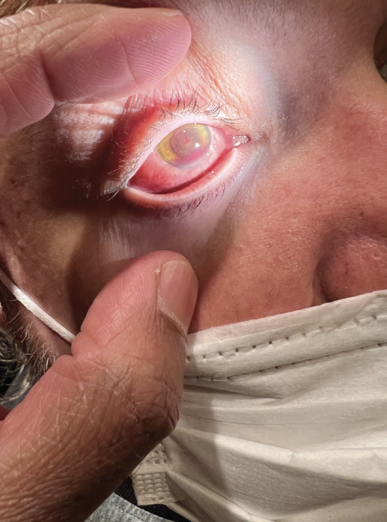 Figure 2. Patients with anterior cell, hypopyon, vitritis, ciliary flush, and decreased visual acuity should be immediately referred to the treating retina specialist for suspected iatrogenic endophthalmitis.
