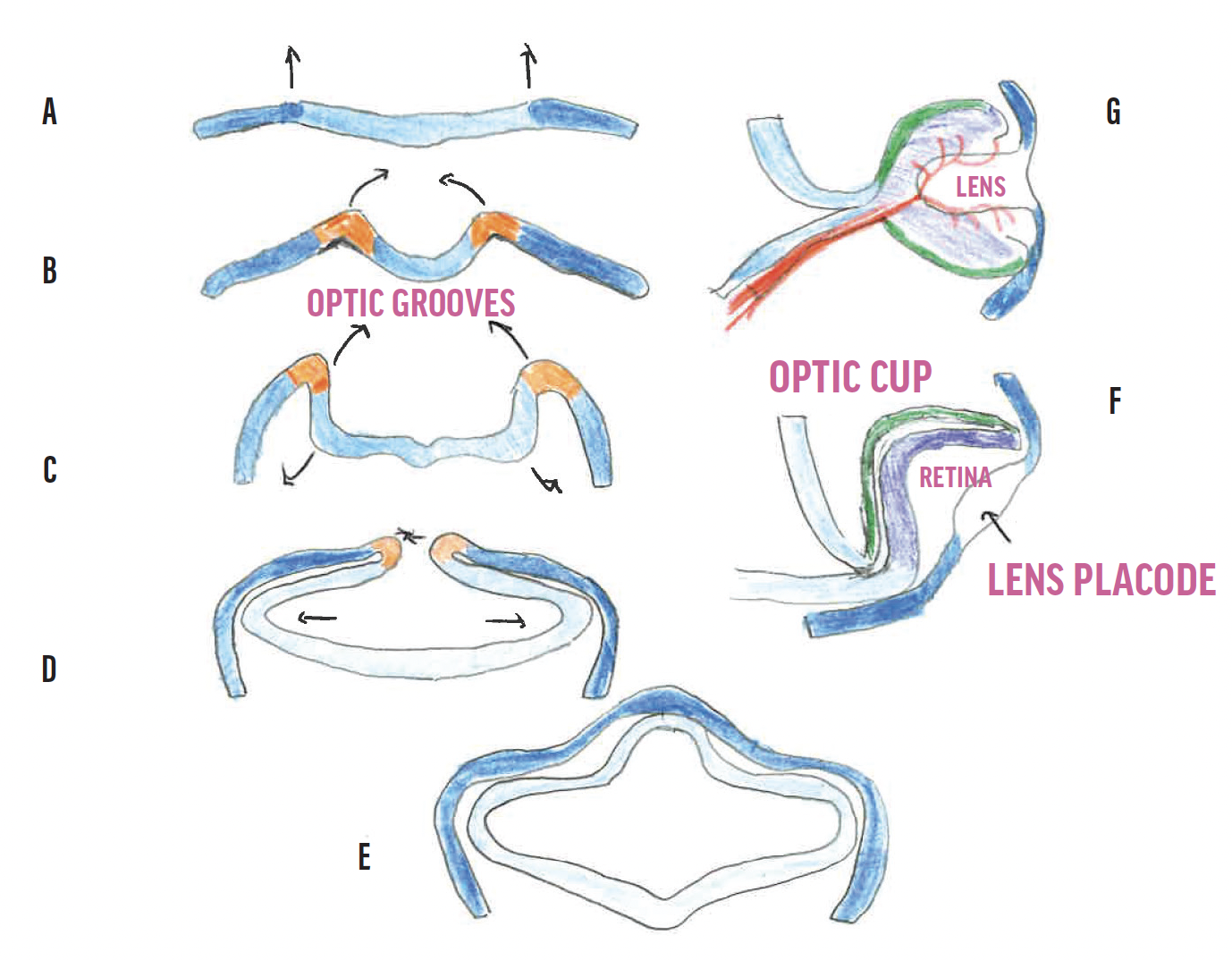 Initially crude and bud-like in shape, the optic vesicles extend laterally into the connective tissue (ie, the mesenchyme) and toward the surface ectoderm, where they adopt a mushroom-like shape with an everted head, termed the optic cup. Concurrently, a feature of the surface ectoderm known as the lens pit deepens and invaginates, eventually forming the lens vesicle (Figure, E-G). To revisit the balloon analogy, the optic cup’s expansion along with the lens vesicle’s invagination is akin to a person grabbing and manipulating a balloon, causing these important developmental structures to take form.