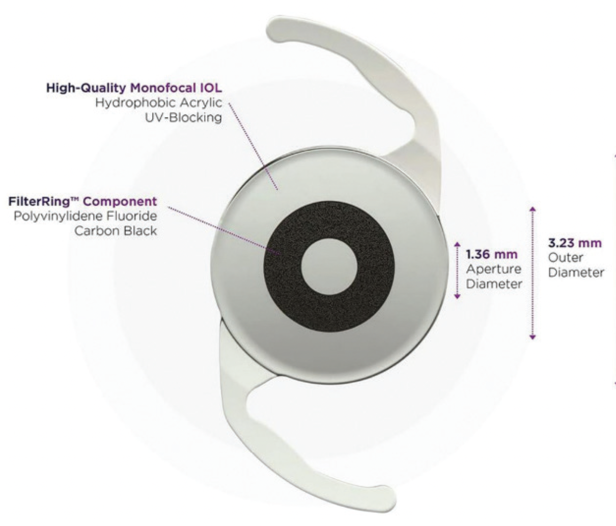 IOLs such as the IC-8 Apthera use pinhole optics to extend depth of focus and reduce glare (Figure 5). Although classified as EDOF lenses, small-aperture IOLs have a unique mechanism of action that may be especially beneficial to eyes for which multifocal optics are contraindicated. A central opaque ring limits peripheral aberrations and enhances depth of focus. Thus, these lenses can be an excellent choice for patients with higher-order aberrations or irregular corneas such as from keratoconus.