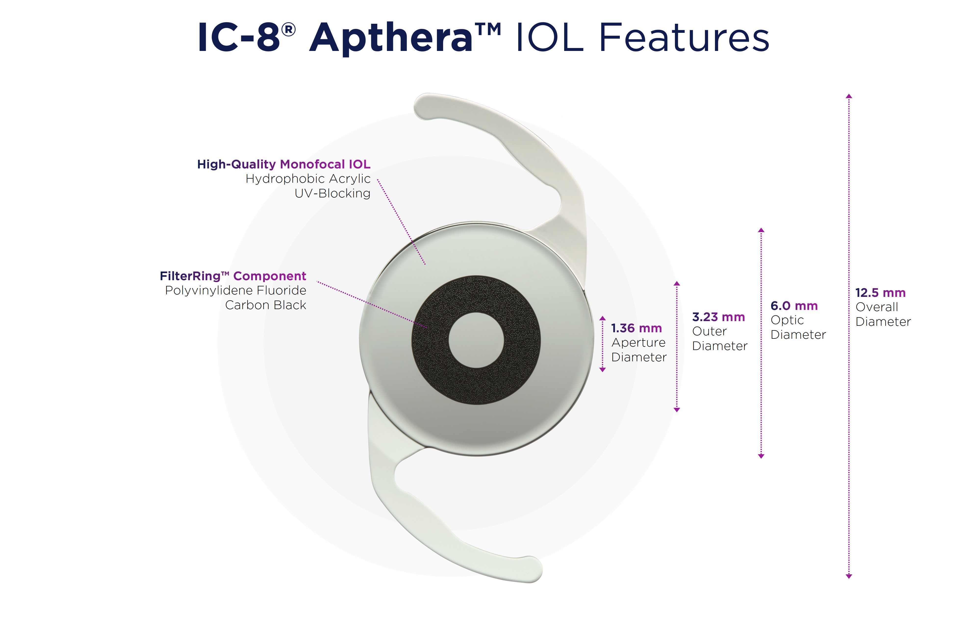 “I am thrilled to have the privilege of treating the first commercial patients with the Apthera IOL and its novel mechanism of action,” said Dr. Thompson. “Featuring its embedded FilterRing component, this unique lens mitigates presbyopia’s effects in an elegantly simple way—by filtering out peripheral defocused and aberrated light that degrades image quality to allow only central focused light to be delivered to the retina. Now, even our patients with as much as 1.5 D of corneal astigmatism can enjoy a continuous range of vision from far through intermediate and near.”