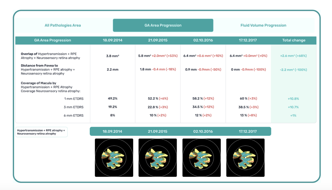 Further Progression Tracking enhances GA management by visualizing changes over time, supporting timely and accurate treatment decisions. By streamlining workflows and providing actionable insights, this feature helps ECPs make informed choices and potentially preserve vision in GA patients.