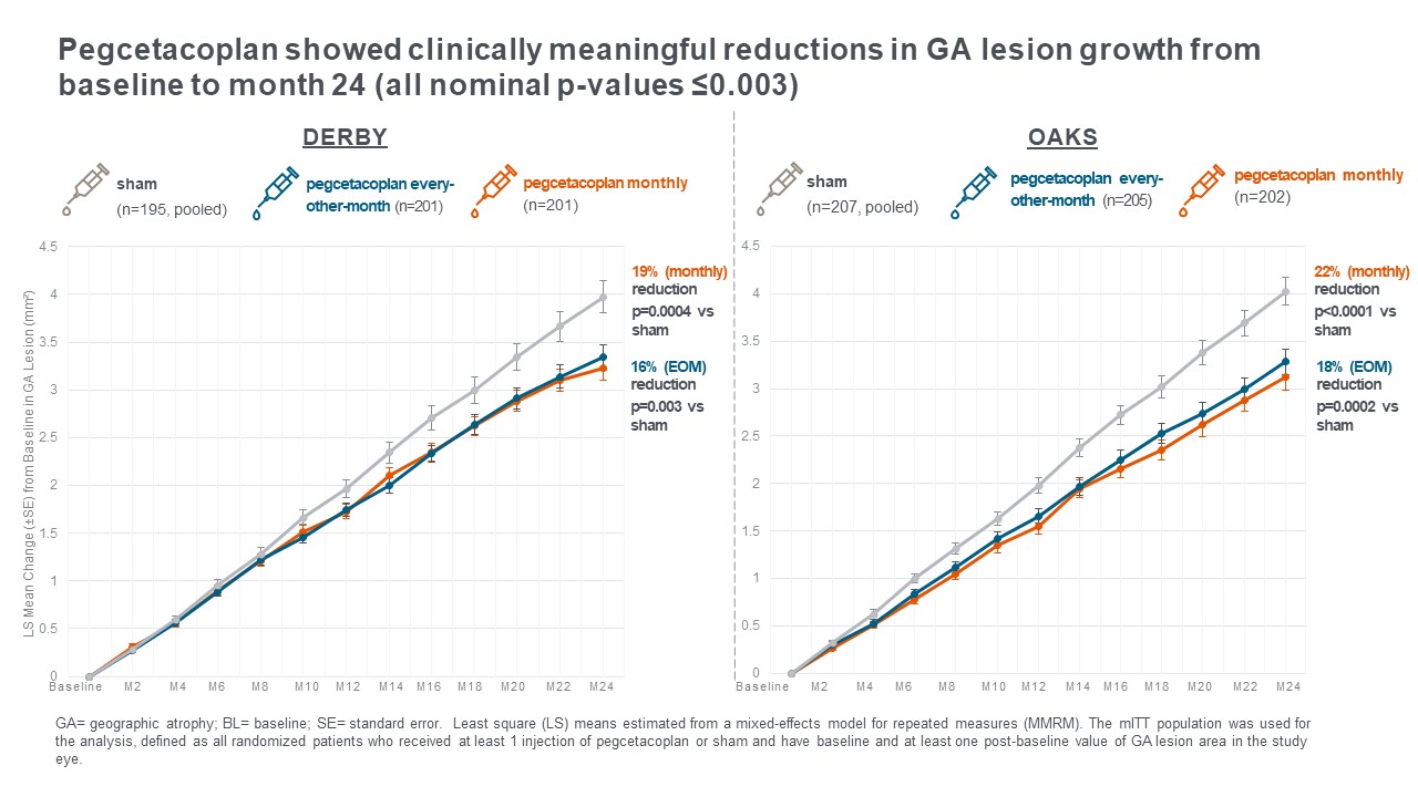 In a pre-specified analysis of GA lesion growth over 24 months, both monthly and every-other-month (EOM) pegcetacoplan showed a clinically meaningful reduction in GA lesion growth from baseline compared to sham (all P-values are nominal):