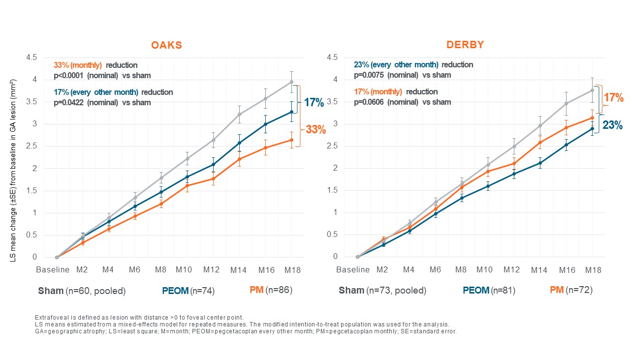 - Pegcetacoplan reduced extrafoveal GA lesion growth in OAKS by 33% (P<0.0001) and 17% (P=0.0422) with both monthly and every-other-month treatment, respectively, and in DERBY by 17% (P=0.0606) and 23% (P=0.0075), respectively.