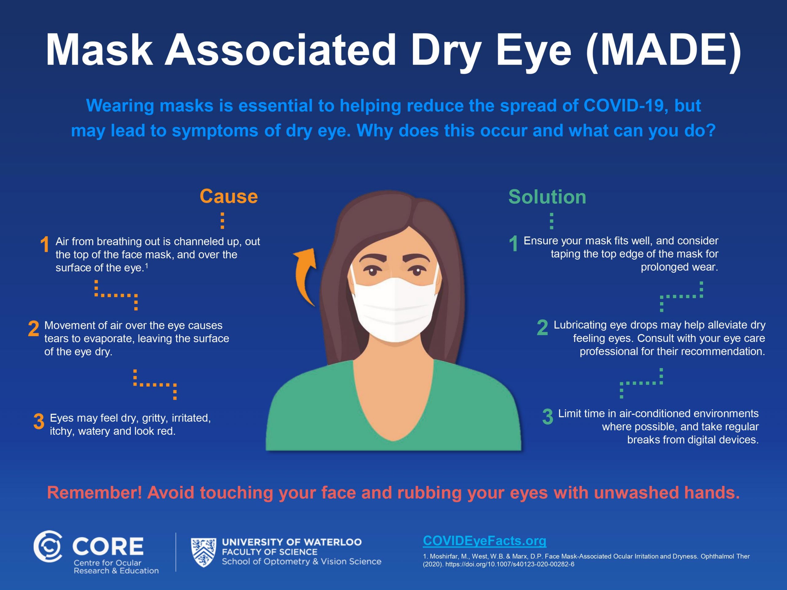 As illustrated in its new MADE infographic (available for download from COVIDEyeFacts.org), CORE recommends that mask wearers experiencing dry eye symptoms try straight-forward solutions:
