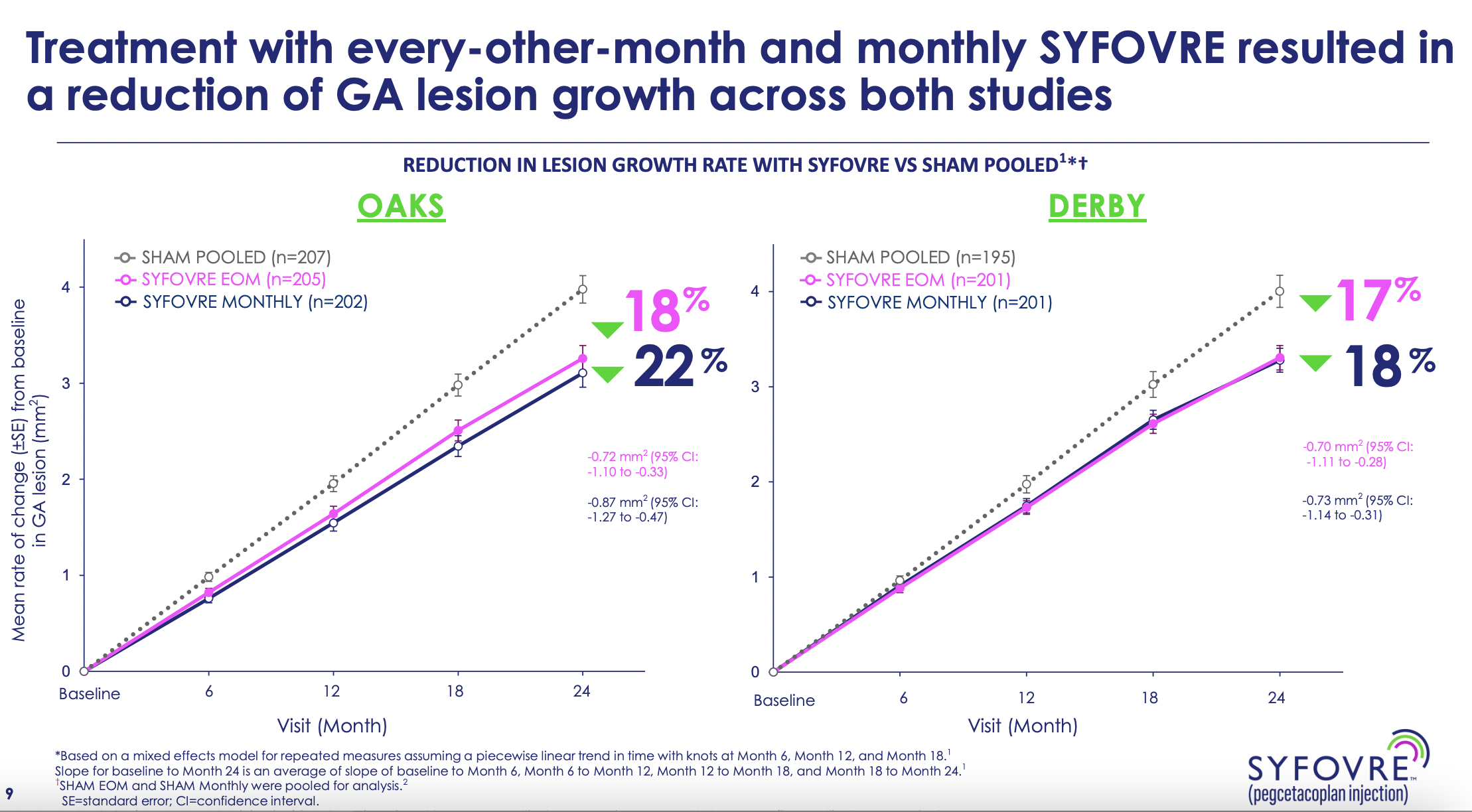 The approval of Syfovre is based on positive results from the phase 3 OAKS and DERBY studies at 24 months across a broad and representative population of patients. Syfovre is approved for GA patients with or without subfoveal involvement and provides dosing flexibility for patients and physicians with a dosing regimen of every 25 to 60 days. In the OAKS and DERBY studies, Syfovre reduced the rate of GA lesion growth compared to sham and demonstrated increasing treatment effects over time, with the greatest benefit (up to 36% reduction in lesion growth with monthly treatment in DERBY) occurring between months 18-24.