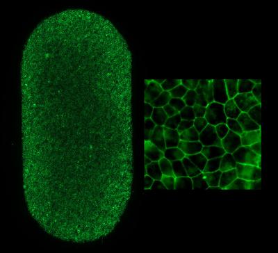 Left shows an image of the full-RPE-patch (2 x 4 mm). Each dot is an RPE cell with the borders stained green. Each patch contains approximately 75,000 RPE cells. Right image shows patch RPE cells at higher magnification. Credit: Kapil Bharti, Ph.D.