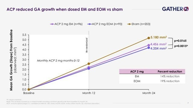 - EOM dosing of Izervay, after a year of monthly dosing, resulted in a reduction of 19% in the mean GA growth rate at 2 years vs. sham (nominal P-value=0.0015).