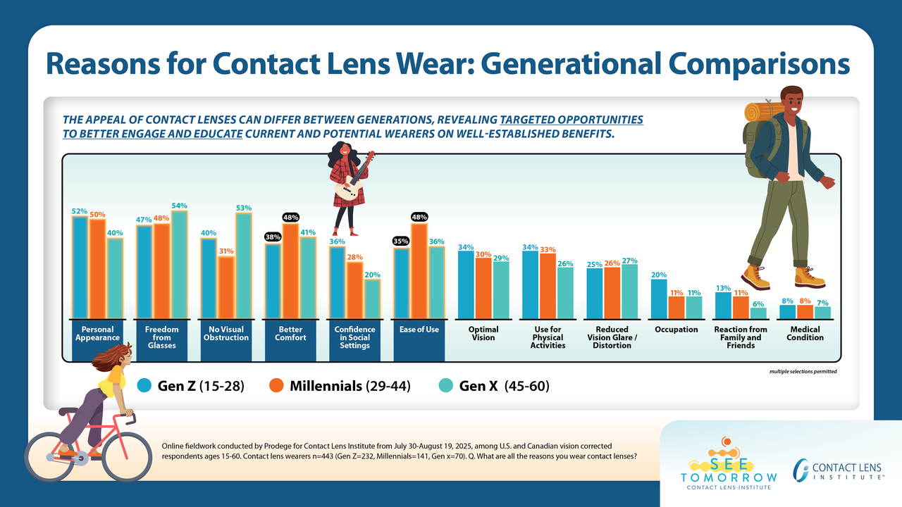 The motivations for wearing contact lenses and the appeal of new lens technologies vary significantly by generation, according to new research from the Contact Lens Institute (CLI) to be presented this week at the 2025 American Academy of Optometry annual meeting.