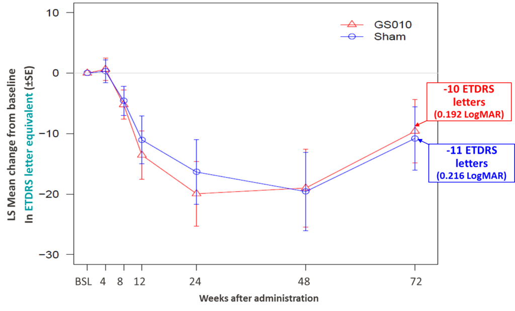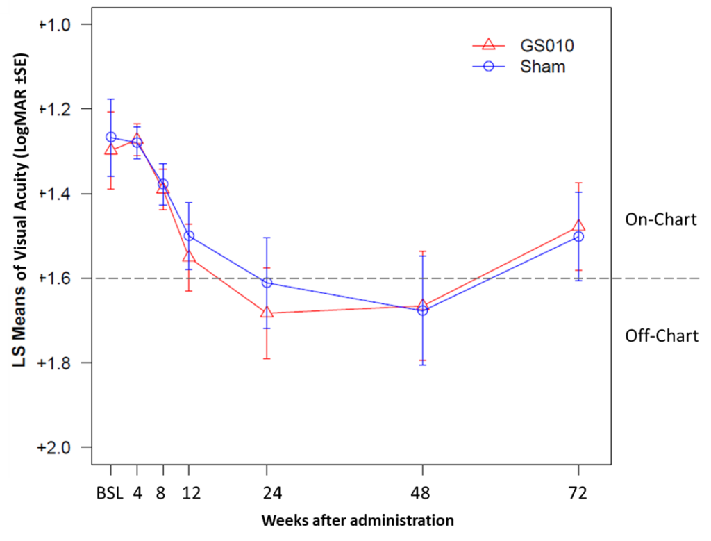 The strength of the bilateral recovery shifted the mean BCVA in both sets of eyes from being off-chart at Week 48 to on-chart at Week 72. In addition, 40% of GS010- and sham-treated eyes improved by a clinically meaningful difference of -0.3 LogMAR (+15 letters ETDRS) from nadir. Similarly, 58% of GS010-treated and 50% of sham-treated eyes improved by a clinically meaningful difference of -0.2 LogMAR (+10 lett ETDRS) from nadir.
