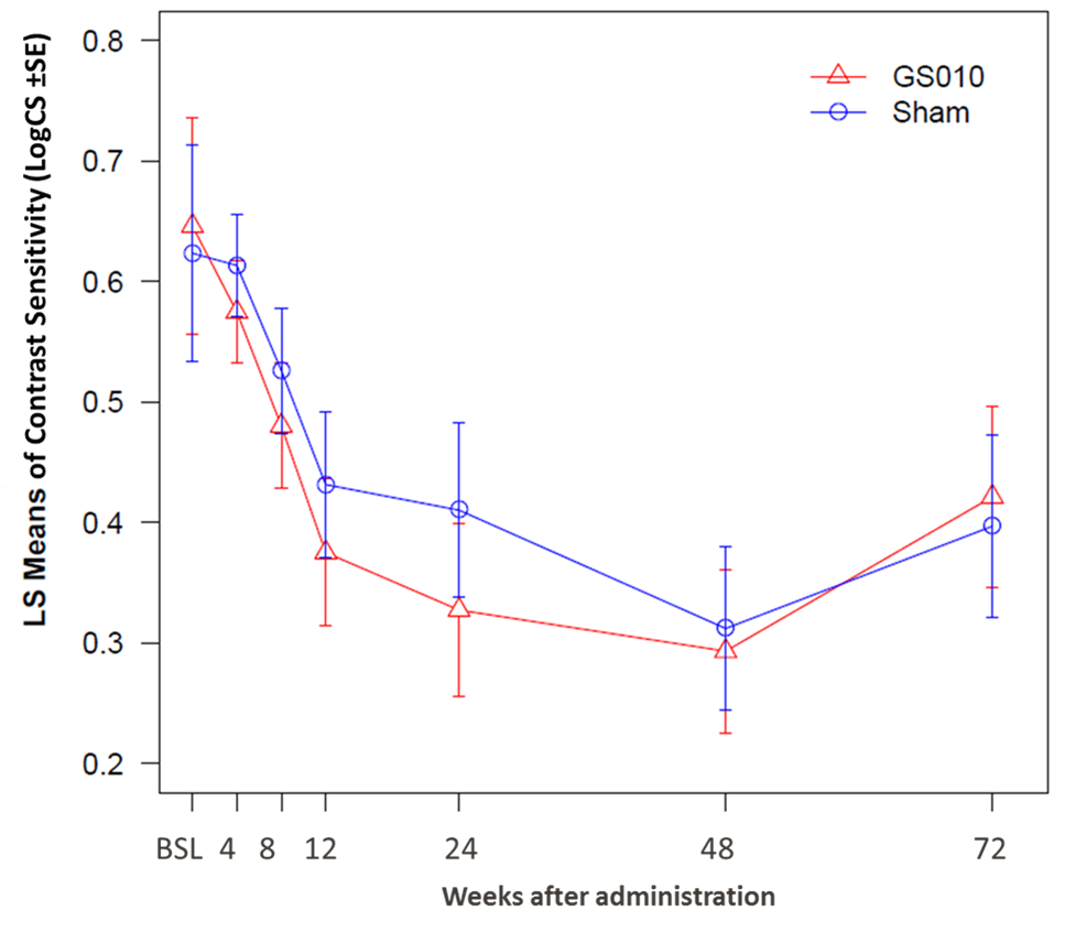 Contrast sensitivity (CS), a second visual function, evolved in a manner similar to BCVA: while values for GS010-treated eyes and sham-treated eyes remained below baseline, CS also recovered so that the gap to baseline diminished at week 72 compared to week 48. The two sets of eyes closely matched each other, so that the difference between their CS values was not statistically significant.