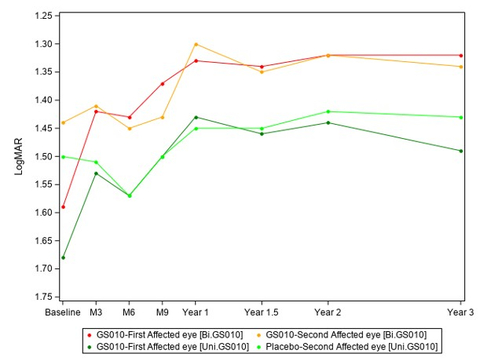 The evolution of the visual acuity over time shows that lenadogene nolparvovec effect is maintained over 3 years for all subjects, with an additional benefit with a bilateral injection as compared to a unilateral injection. Year 3 analyses confirm the dose effect that was noted at Year 1.5 and Year 2, with an absolute difference of the mean visual acuity between arms of +6,5 ETDRS letters in favor of bilaterally treated subjects at Year 3.