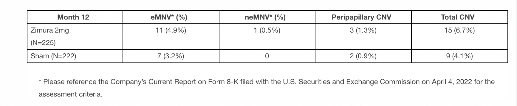The incidence of choroidal neovascularization (CNV) in the study eye through month 12 was 15 patients (6.7%) in the Zimura 2 mg group and 9 patients (4.1%) in the sham control group. Similar to GATHER1, the company’s first phase 3 clinical trial of Zimura in GA, an independent masked reading center assessed the CNV cases in GATHER2 at the 12-month timepoint for exudative macular neovascularization (eMNV) and non-exudative macular neovascularization (neMNV). The accompanying table summarizes this analysis: