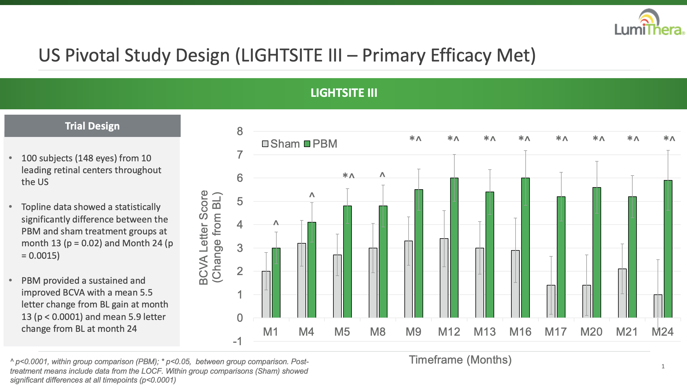 The analysis included 91 eyes in the PBM treatment group and 54 eyes in the sham-treatment group in the modified intent to treat population with at least 1 post-treatment visit. The trial initially demonstrated sustained and statistically significant improvement in the primary endpoint, BCVA, at 13 months in the PBM treatment group when compared to the sham-treatment group (P=0.02). Now, a sustained, mean increase in ETDRS letter score >5.0 letters from baseline is reported at both the 13- and 21-month timepoints in the PBM-treated subjects BCVA (P<0.0001). The improvement from baseline in BCVA at 24 months in the PBM treatment group was significantly greater than in the sham group, 5.9 vs 1.0 letters (P=0.0015). Approximately 58% of the PBM-treated eyes had >5 letter gain with a mean of 8.5 + 0.5 letter gain.