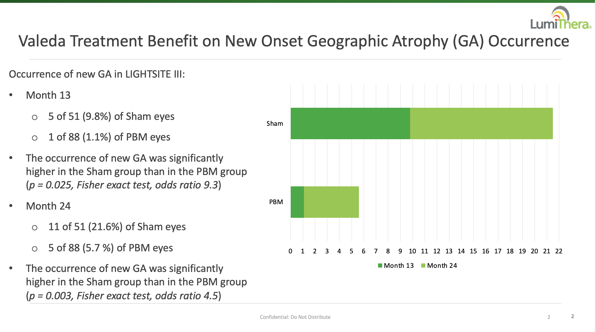 LIGHTSITE III, a prospective, double-masked, randomized, multicenter clinical trial, was conducted at ten US retinal centers and enrolled 100 subjects with early to intermediate dry AMD. Eyes were treated with the Valeda system every 4 months. The last treatment was administered at 21 months and the last follow-up visit was at 24 months. The primary efficacy endpoint was best corrected visual acuity (BCVA). At 24 months there were minimal safety risks and high patient compliance; 80% of the patients completed the trial. In the PBM-treated arm there was a statistically significant visual acuity improvement at month 21 following the last treatment with sustained vision benefits throughout the trial including the 24-month trial end, according to LumiThera.