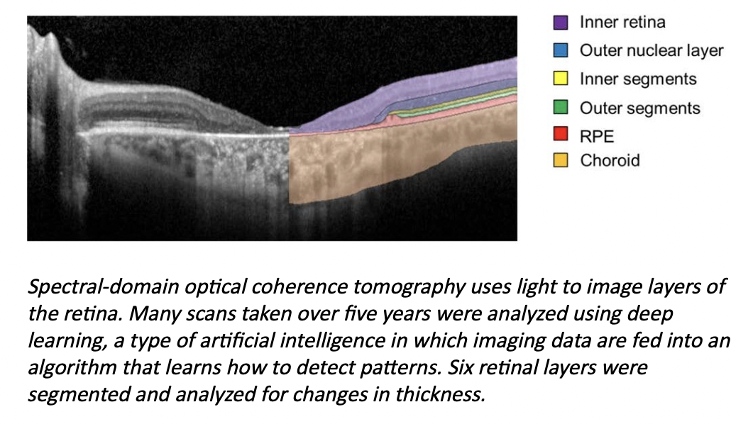 The researchers followed 66 Stargardt patients (132 eyes) for 5 years using a retinal imaging technology called spectral-domain optical coherence tomography (SD-OCT). The cross-sectional, 3D SD-OCT retinal images were segmented and analyzed using deep learning, a type of artificial intelligence in which huge amounts of imaging data can be fed into an algorithm, which then learns to detect patterns that allow the images to be classified.