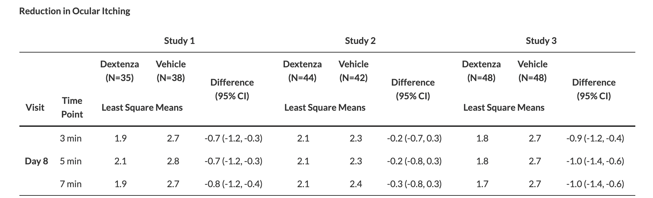 The efficacy of Dextenza for the treatment of ocular itching associated with allergic conjunctivitis was based on three randomized, multicenter, double-masked, parallel group, vehicle-controlled studies in subjects with a positive history of ocular allergies and positive skin test reaction to perennial and seasonal allergens (n=255). In all three trials, Dextenza demonstrated lower mean ocular itching scores compared with the vehicle group at all time points throughout the study duration of up to 30 days. In two of the three studies, a higher proportion of patients had statistically significant reductions in ocular itching on Day 8, at 3 minutes, 5 minutes and 7 minutes post-challenge in the Dextenza group compared to the vehicle group. Data for the primary endpoint, ocular itching at Day 8, is shown below for all three studies (scale 0-4):