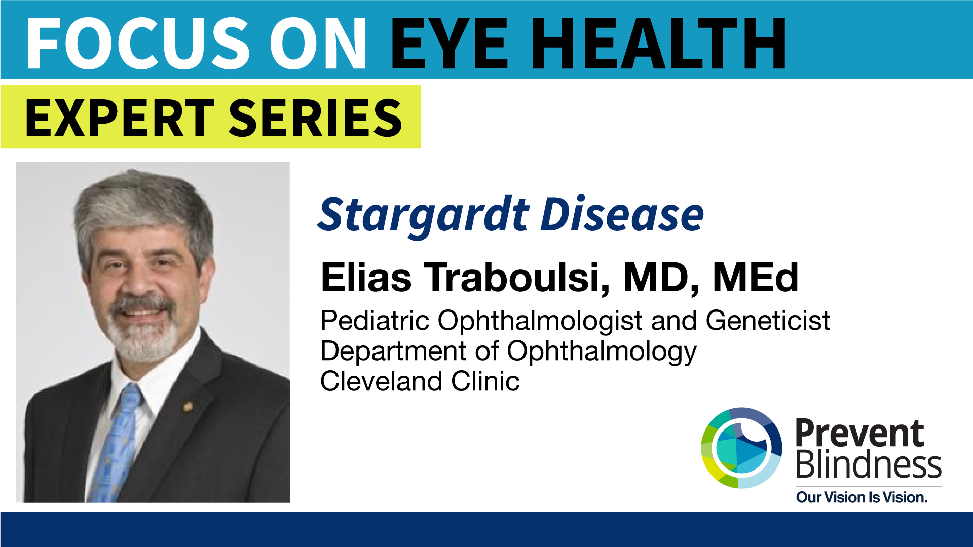 As part of its Focus on Eye Health Expert Series, Prevent Blindness offers the new episode, “Stargardt Disease,” featuring Elias Traboulsi, MD, MEd, Pediatric Ophthalmologist and Geneticist, Department of Ophthalmology, Cleveland Clinic.