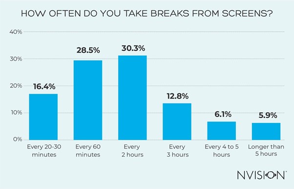 The most common break period for regular screen users was every 2 hours (30.3%), way beyond the recommended 20 minutes.