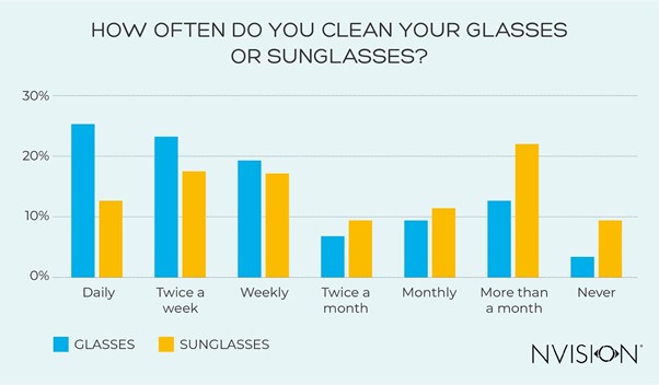 Generally, we’re better at cleaning our glasses than we are our sunglasses. A quarter (25.1%) said they clean their glasses daily, but only 12.9% would clean their sunglasses daily (in a period where they would be worn regularly).