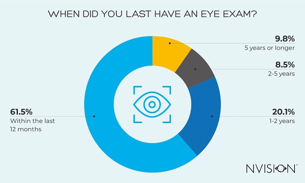 - 1 in 10 (9.8%) have not had an eye exam in over 5 years, with 23% saying the pandemic is to blame for not having a recent (<1 year) appointment