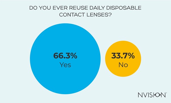 Of our sample, 66.3% admitted that they do reuse daily contact lenses, which is not far from results published by the American Optometric Association (AOA). Their study found that almost half of contact lens wearers (including daily lenses) were wearing them for longer than the recommended time.