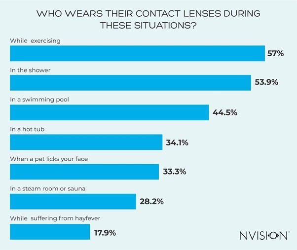 We also asked our respondents about a range of situations where wearing contact lenses can lead to potential eye health problems. Exercising can be dangerous due to lenses moving around or getting knocked out, however this is often a preferable choice compared to glasses.