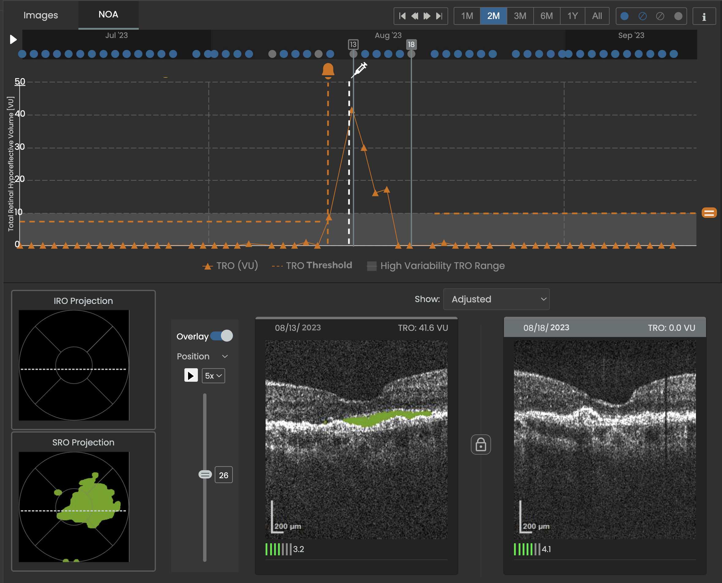 Figure 1: SCANLY Home OCT longitudinal disease biomarker volume trajectory with notification and treatment indicators (top) and corresponding projection map of subretinal hypo-reflective (SRO) spaces and B-scans (bottom).