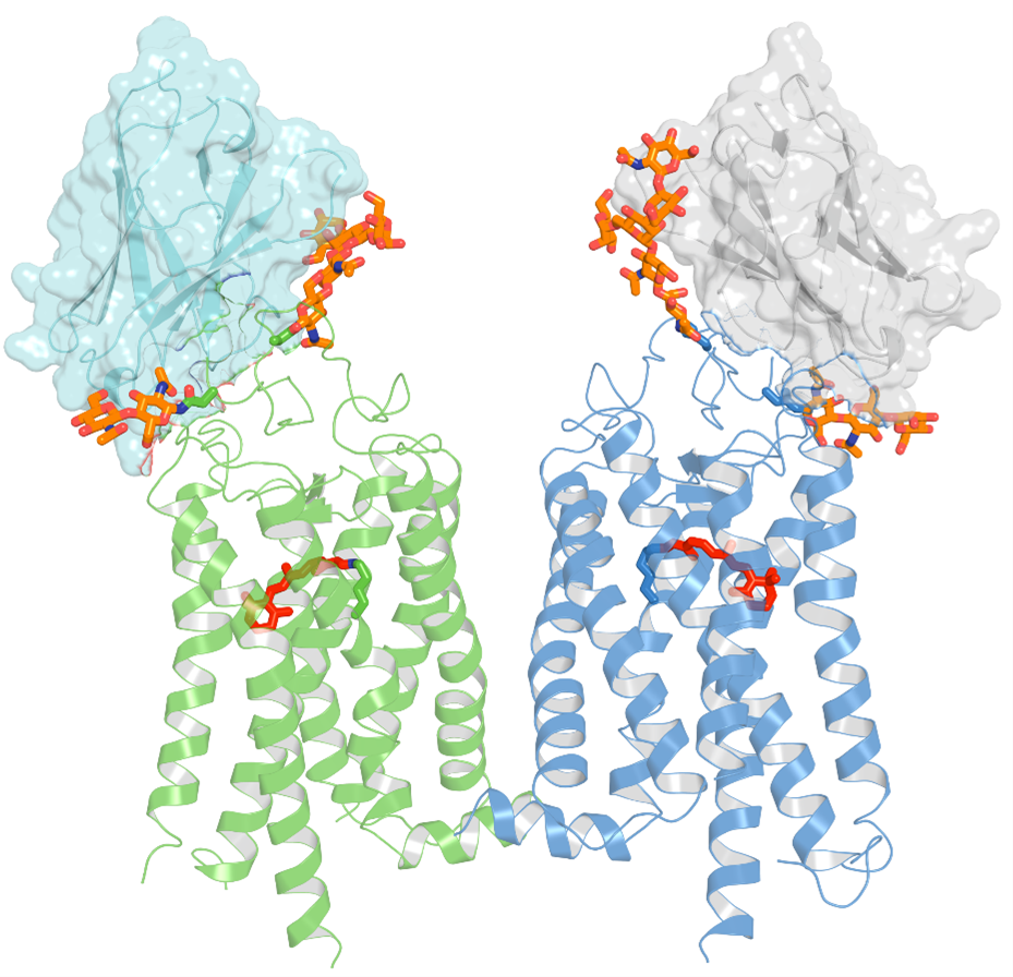This image depicts the crystal structure of two nanobodies binding to a rhodopsin dimer. The rhodopsin molecules are shown in green and blue, with 11-cis-retinal displayed in red. The figure emphasizes the significant interactions between the nanobodies (represented in a semi-transparent surface cartoon) and the extracellular surface of rhodopsin, including its N-terminal glycans highlighted in orange.